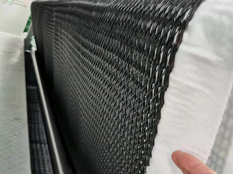 2、將滲排水片材按設(shè)計要求平鋪在場地上,當排水場地長度超過滲排水片材的長度時,需要進行連接。連接方式采用尼龍扣,尼龍扣間隔8-10cm。寬度方向不需要連接。
